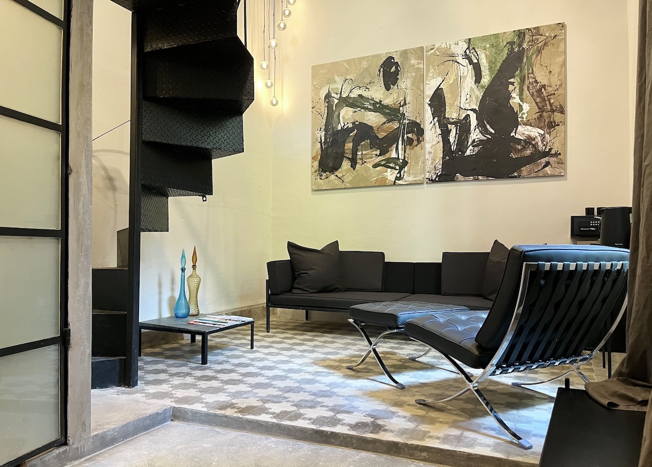 The monumental rooms have been transformed into a balanced cocktail of eclectic tiles, 5-meter-high ceilings and authentic wooden doors that naturally blend with large contemporary artworks, a prominent iron window with a green patio view, a masculine concrete bathroom, textured walls and a salon with a prominent ‘Roman Bath’ as a private wellness centerpiece.