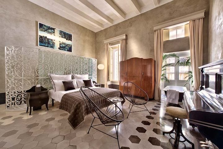 This room also benefits from a Hidrobox bath tub purposely placed in the traditional Maltese balcony, to take advantage of the exclusive view of the Carmelite Church’s architecture with its grand facade standing only five metres across. Moreover, great views of Valletta’s narrow Old Theatre street can be enjoyed from the tall window.
