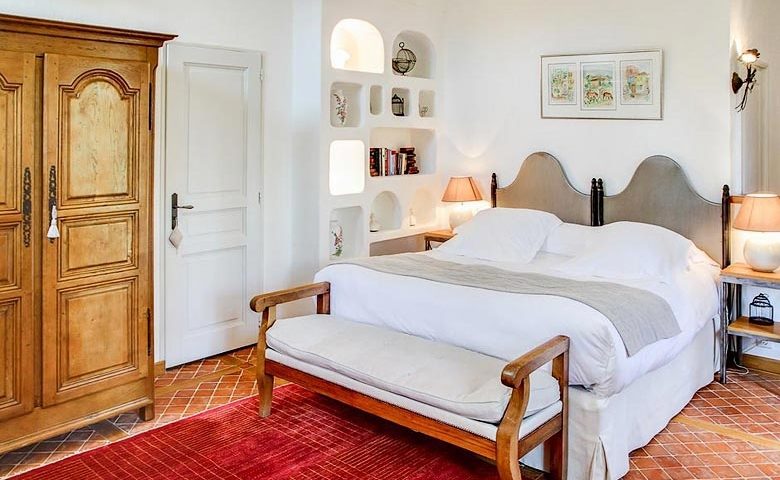 The double bedroom has a large bed (Queen size) situated on a mezzanine. The room is in the restored ancient pigeon house at La Bastide de Moustiers. By the main building, and near the pool, the room has a large view on the park, the garden and the village. Bathtub and twin washbasins. Floor made with Salernes tiles.