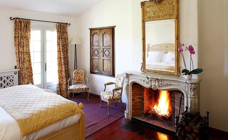 Situated in a small independent building below the main building at La Bastide de Moustiers, the double bedroom has a large bed (Queen size), a small private terrace and direct access to the park. It also has a beautiful view on the park and the village as well as a lovely fireplace. The bathtub and the washbasin are designed by Philippe Starck. Separate shower. Floor made with Salernes tiles.