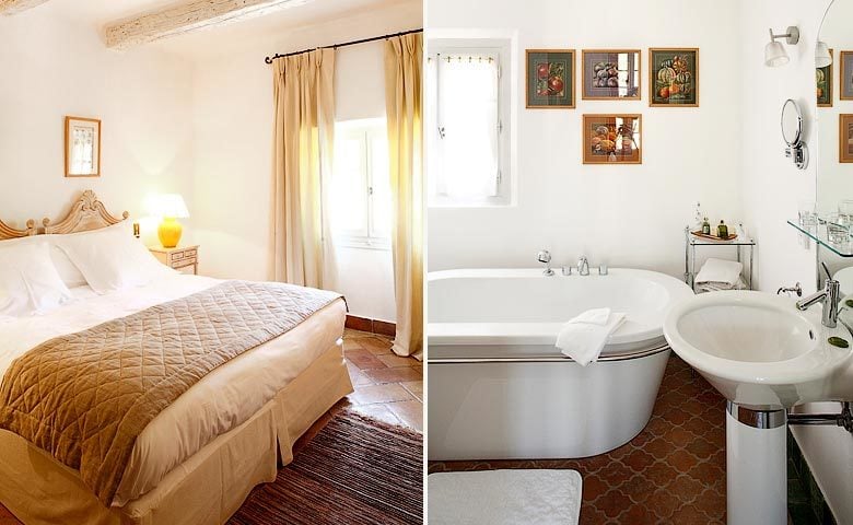 On the first floor at La Bastide de Moustiers, this spacious room is decorated with immaculate linen and a large four-poster wooden bed. The bathtub is surrounded by Salernes tiles made by local artist Alain Vagh and decorated by l’atelier Soleil. Twin washbasins and bidet. A particularly luminous bathroom.