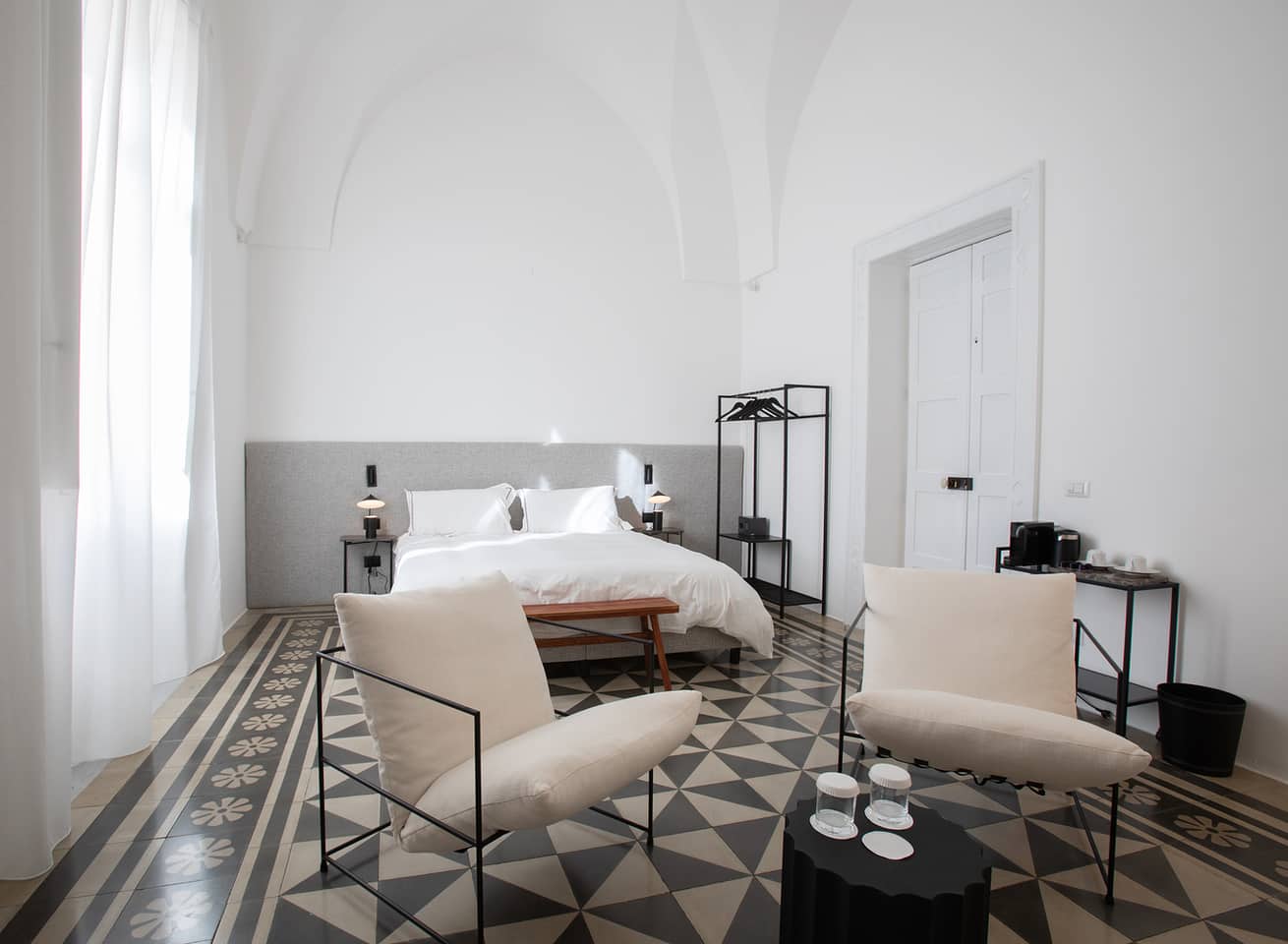 Specifically designed to evoke the deep red tones of Puglia's most celebrated wines, such as Salice Salentino and Primitivo di Manduria, this room features high ceilings and a captivating bathroom ambience. It's an ideal choice for those who value outdoor spaces, offering a spacious 25-square-meter balcony overlooking the pool and garden. Whether you want to bask in the sun, host an intimate dinner party, or simply savour a glass of Primitivo, this room provides the perfect setting to capture the moment.