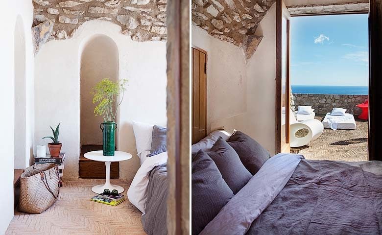 Torre Amalfi is right above the Amalfi Coast and in between the gulf of Naples and the Gulf of Salerno and offers extraordinary views of the island of Capri and the Mediterranean. The tower has been transformed into a stylish yet rustic guest accommodation. Upon entering the tower on the ground floor, there is a living area with a dining space, a well-equipped kitchen and a mezzanine bedroom with towering ceilings and light coming from the windows above.
